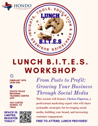 The Hondo EDC recently hosted another impactful Lunch B.I.T.E.S. workshop focused on helping small businesses turn their social media presence into a revenue generating tool. This session centered on practical strategies for creating intentional content, increasing engagement, and converting online visibility into real sales. Attendees learned how to better position their brand, craft effective calls to action, and use their platforms more strategically to drive measurable results.